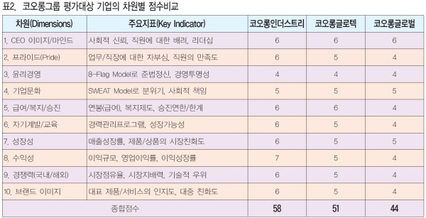 [위대한 직장찾기 18-1:코오롱그룹]코오롱그룹 평가대상 기업의 차원별 점수비교[국가정보전략연구소]