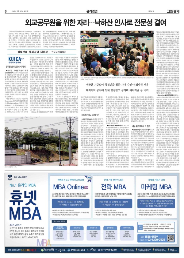 2013년 05월 15일자 신문에 실린 [윤리경영 대해부] 한국국제협력단 편 기사를 소개합니다.