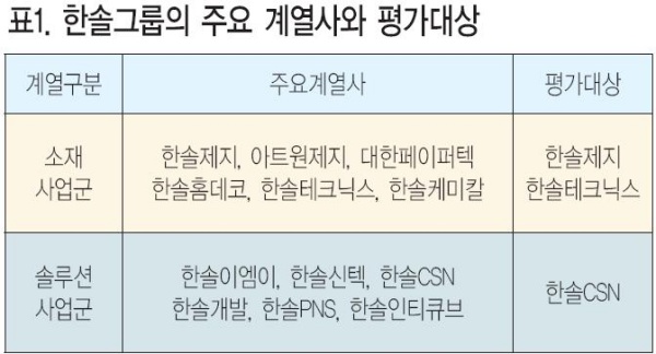 중견그룹인 한솔은 국내 23개, 해외 16개 총 39개의 계열사를 가지고 있으며, 주요계열사는 표1과 같이 소재사업군, 솔루션사업군 등으로 구분할 수 있다.