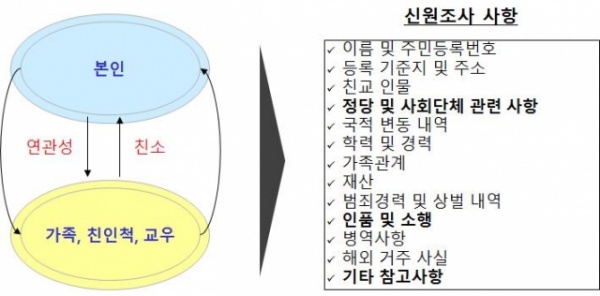 보안업무규정 시행규칙 제3장 제58조에 따르면 신원조회는 공무원 임용예정자 본인과 가족, 친인척, 교우 등을 대상으로 한다. 신원조사 사항은 이름 및 주민등록번호, 등록 기준지 및 주소, 친교 인물, 정당 및 사회단체 관련 사항, 국적 변동 내역, 학력 및 경력, 가족관계, 재산, 범죄경력 및 상벌 내역, 인품 및 소행, 병역사항, 해외 거주 사실, 기타 참고사항 등 13가지에 달한다.