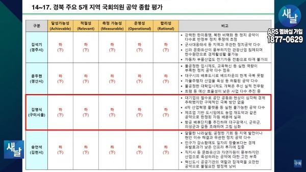 [기획-국회의원 공약 평가] ⑯새날 방송, 경상북도 구미시을 김영식 의원···달성가능성 등 5개 부문 모두 하(下)