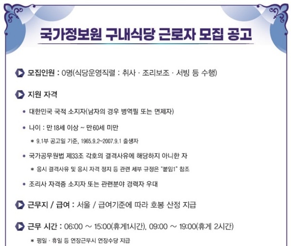[국정원 채용 정보] 2025년도 국가정보원 구내식당 근로자 모집 공고