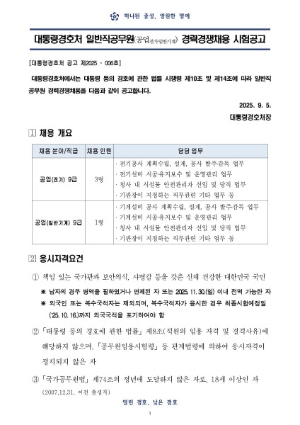 [대통령 경호처 채용 정보] 대통령경호처 일반직공무원(공업-전기·일반기계) 경력경쟁채용 시험공고(2025.09.05 ~ 2025.09.15)