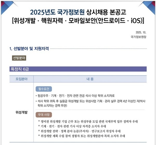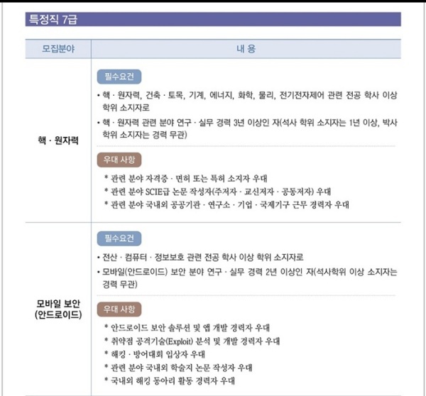 위성개발·핵원자력·모바일보안(안드로이드·iOS) 분야에 특정직 6급 및 7급 채용