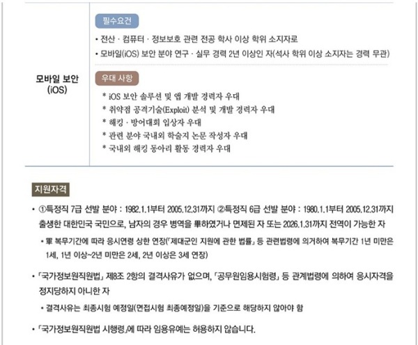 - 모바일(iOS) 보안 분야 연구• 실무 경력 2년 이상인 자(석사 학위 이상 소지자는 경력 무관)