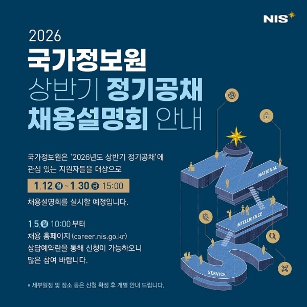 국가정보원(원장 이종석, 이하 국정원)에 따르면 2026년 1월12일(월)부터 1월30일(금)까지 '2026년 국가정보원 상반기 정기공채 채용설명회'를 개최한다.