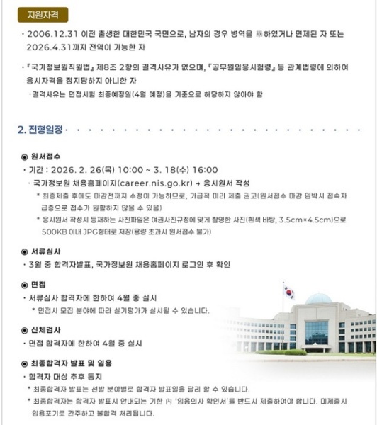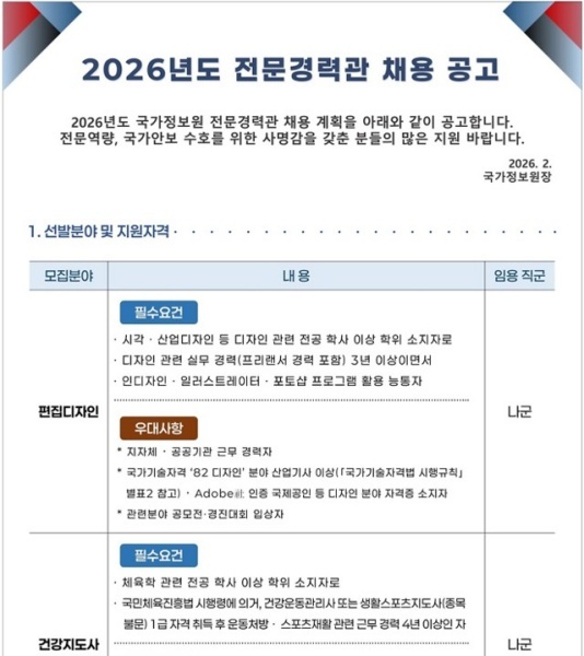 [국정원 채용 정보] 2026년도 국가정보원 전문경력관 채용 공고(원서접수 기간 : 2026.2.26(목) 10:00~3.18(수) 16:00)