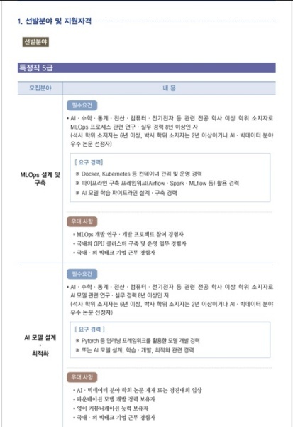 선발분야(특정직 5급)는 MLOps 설계 및 구축, AI 모델 설계·최적화, AI 데이터센터 구축, AI 모델 개발, AI 오케스트레이션 개발 및 운영 등