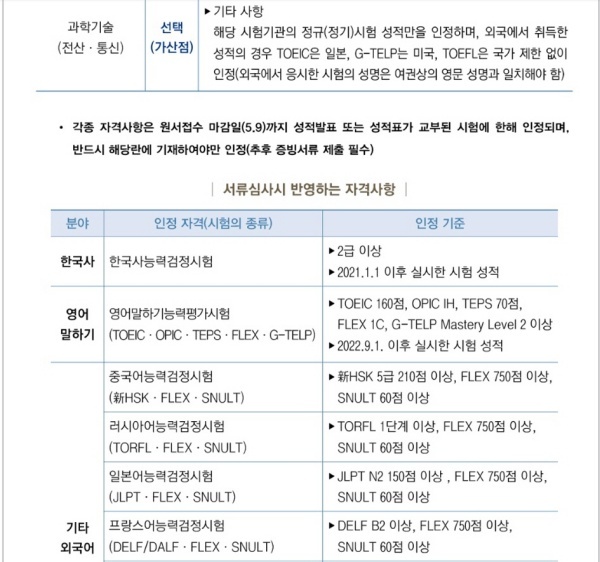 - 응시원서, 자격사하아 영어능력검정시험 성적 등 종합 평가