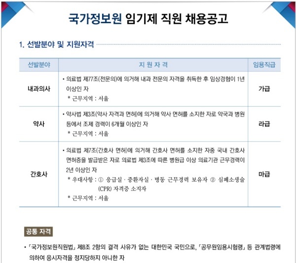 ▲ ▲ 2024년도 국가정보원 임기제 직원 채용 공고[출처=국가정보원 채용사이트]