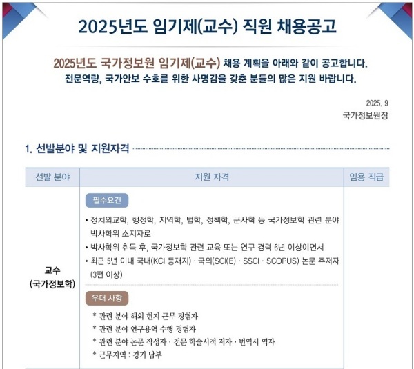[국정원 채용 정보] 2025년 국가정보원 임기제 직원(교수) 채용 공고