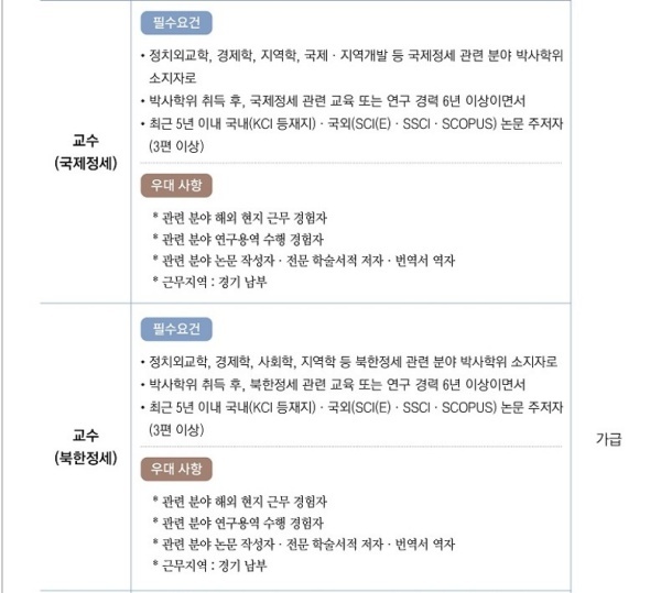 •박사학위 취득후, 북한정세 관련 교육 또는 연구 경력 6년 이상이면서