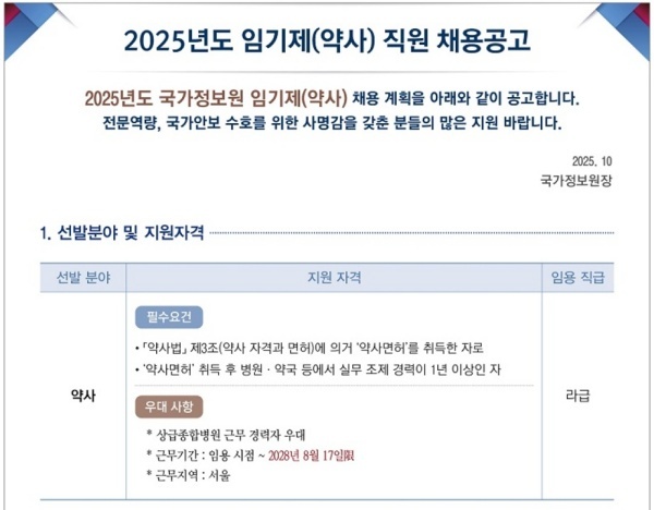 ▲ 2025년도 임기제(약사) 직원 채용공고 [출처=국가정보원]