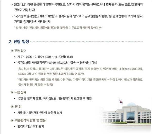 ■ 서류심사 : 10월 중 합격자발표, 국가정보원 채용홈페이지 로그인 후 확인