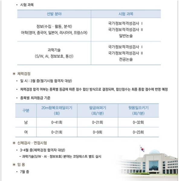 - 과학기술(S/W, AI, 정보보호, 통신) : 국가정보적격심사 I, 국가정보적격검사 II, 전공논술